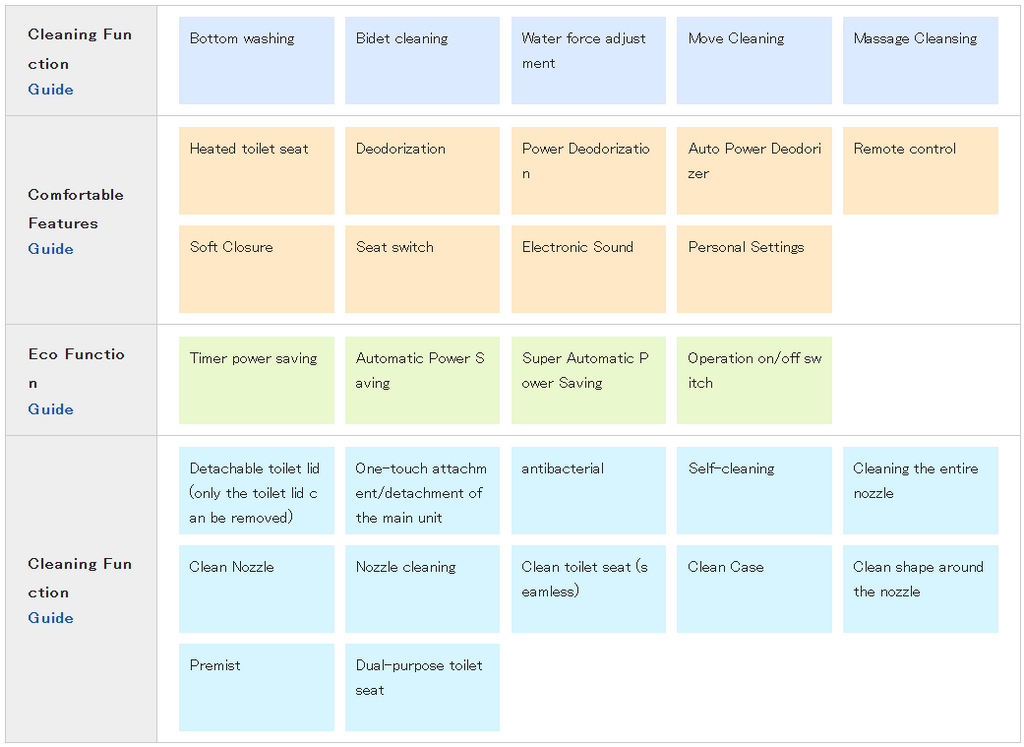 | Chế độ rửa | Rửa hậu môn (おしり洗浄), Rửa phụ khoa (ビデ洗浄), Rửa di động (やわらか洗浄), Rửa massage (マッサージ) |